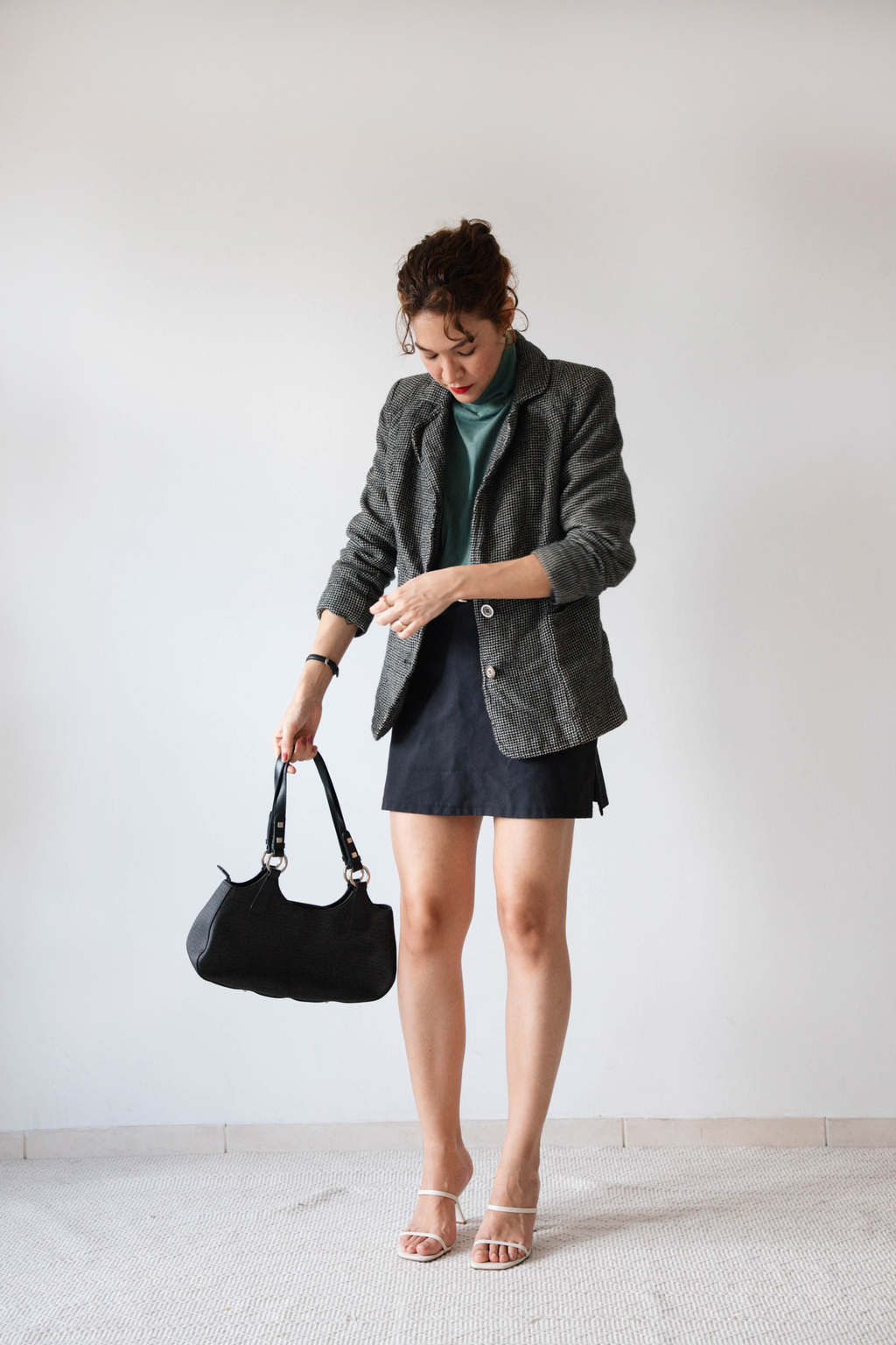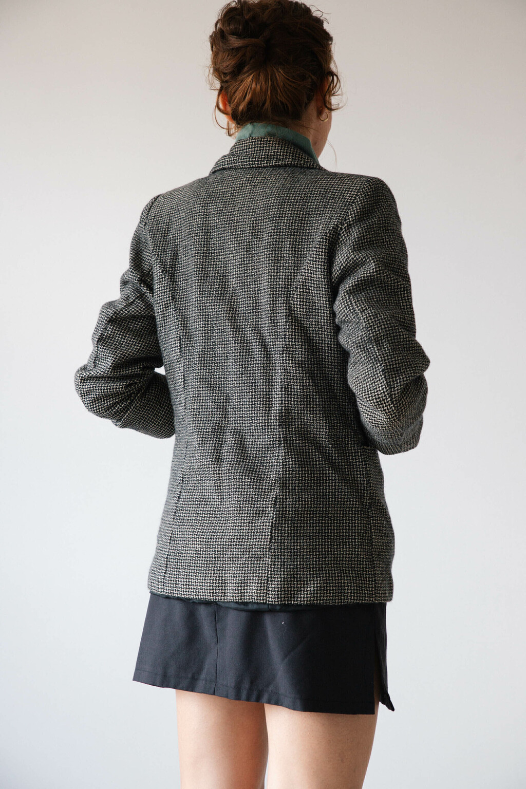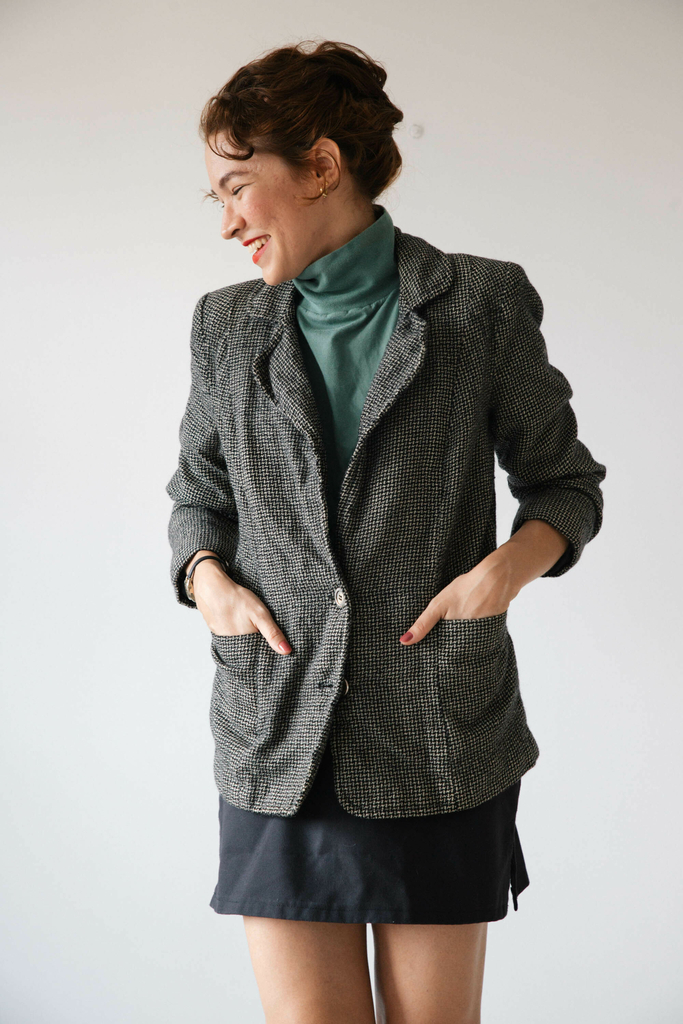 Blazer de lã com estampa piel de poule, possui ombreiras, dois bolsos na frente e botões. Tem forro de acetato.