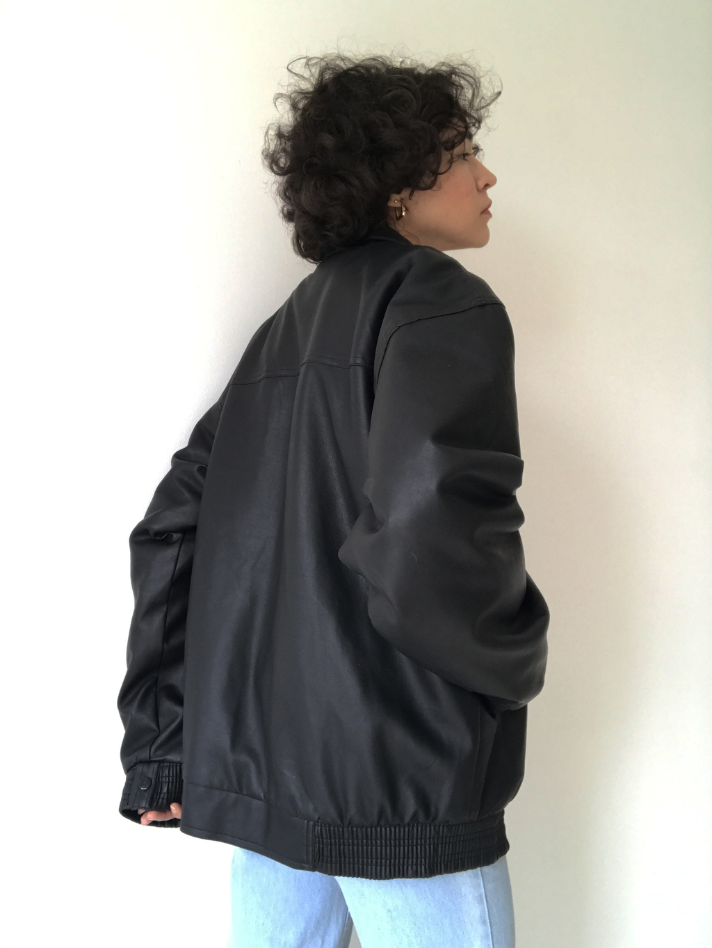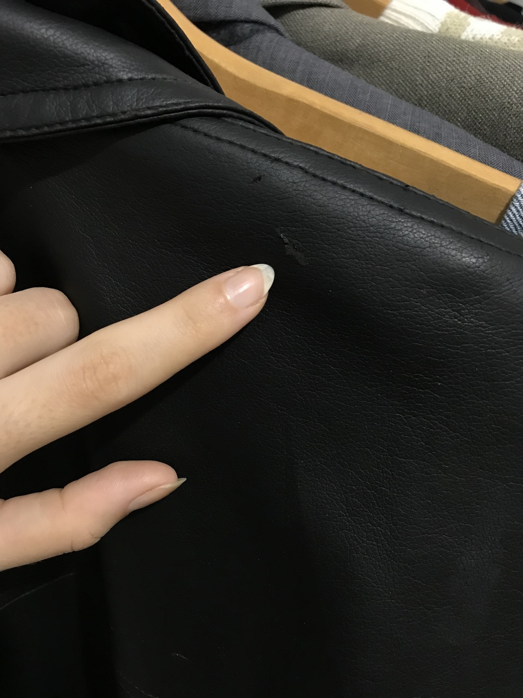 Jaqueta de couro sintético, possui duas golas, dois bolsos na frente e dois fakes, fechamento por zíper e botão de pressão. Possui feixo até na barra onde tem elástico e botão de pressão. Possui elástico no punho. Forro interno fino um pouco acolchoado de nylon. Ela possui alguns detalhes pequenos no comprimento da manga direita e ombros nas costas, ver nas últimas fotos. 9/10