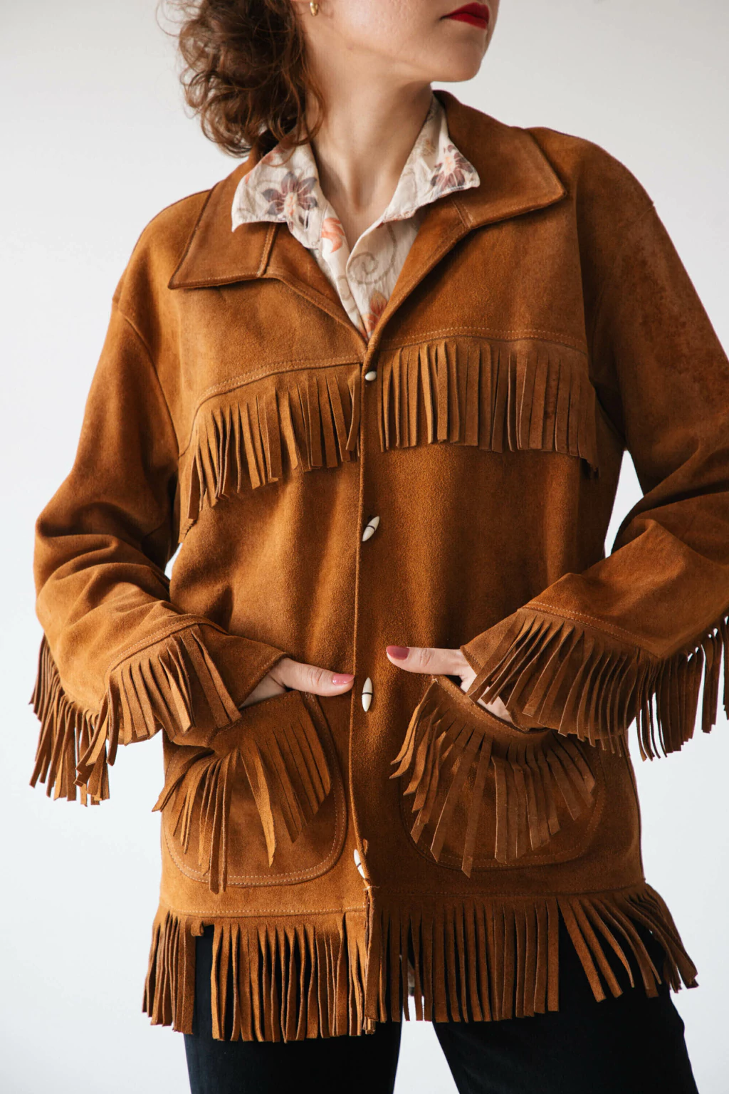 Jaqueta de couro legítimo com franjas, botões e bolsos na frente. Pesada e sem forro.